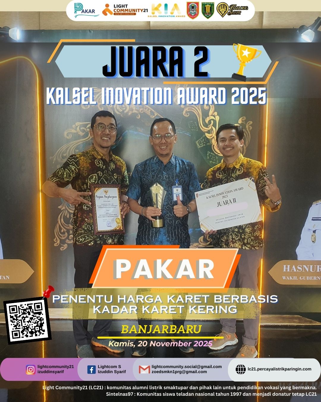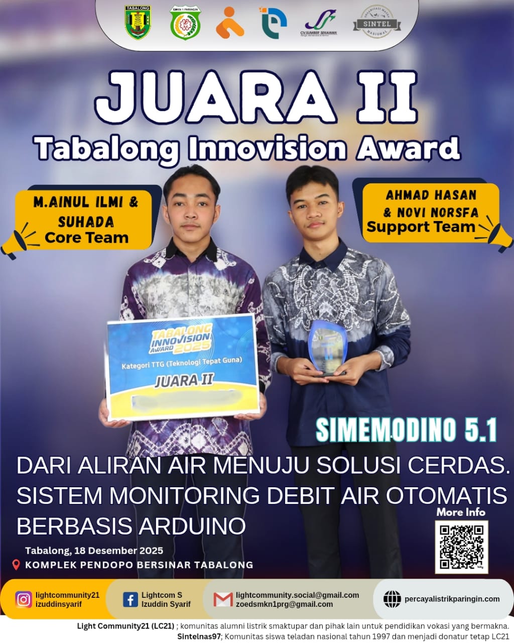 Tim Light Community21 berhasil meraih Juara 2 Tabalong Innovation Award (TIA) 2025 Kategori Teknologi Tepat Guna yang diselenggarakan oleh Bapperida Kabupaten Tabalong melalui inovasi SIMEMODINO 5.1, sistem pengatur dan monitoring debit air berbasis Arduino yang dirancang untuk membantu penghematan air melalui edukasi dan pembatasan pemakaian harian secara terukur. Inovasi ini dikembangkan oleh tim inti M. Ainul Ilmi dan Suhada dengan dukungan Ahmad Hasan dan Novi Norsfa, serta dinilai mampu menghadirkan solusi yang aplikatif, berkelanjutan, dan relevan dengan kebutuhan masyarakat, sehingga memperkuat komitmen Light Community21 dalam menghadirkan teknologi tepat guna yang berdampak nyata.